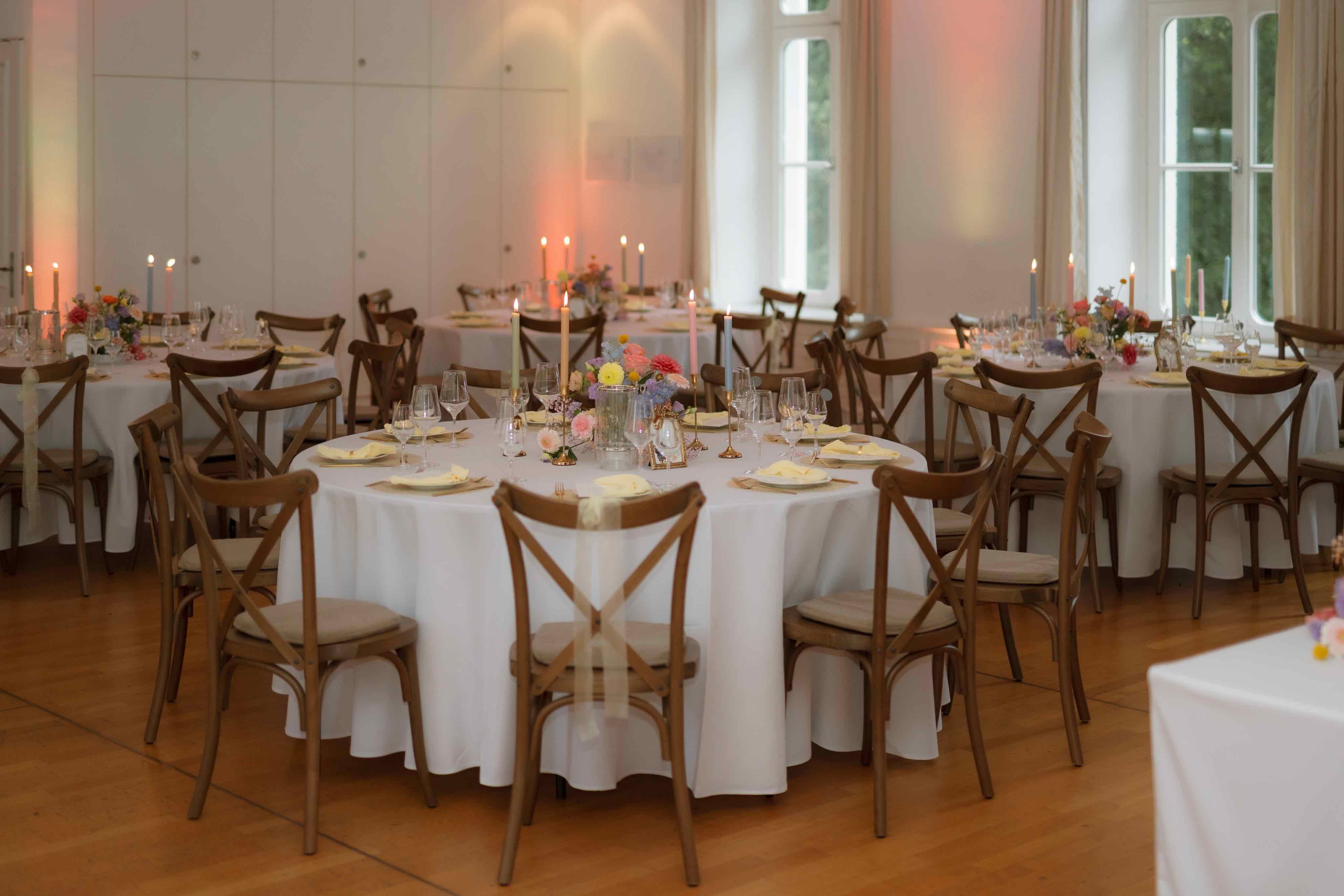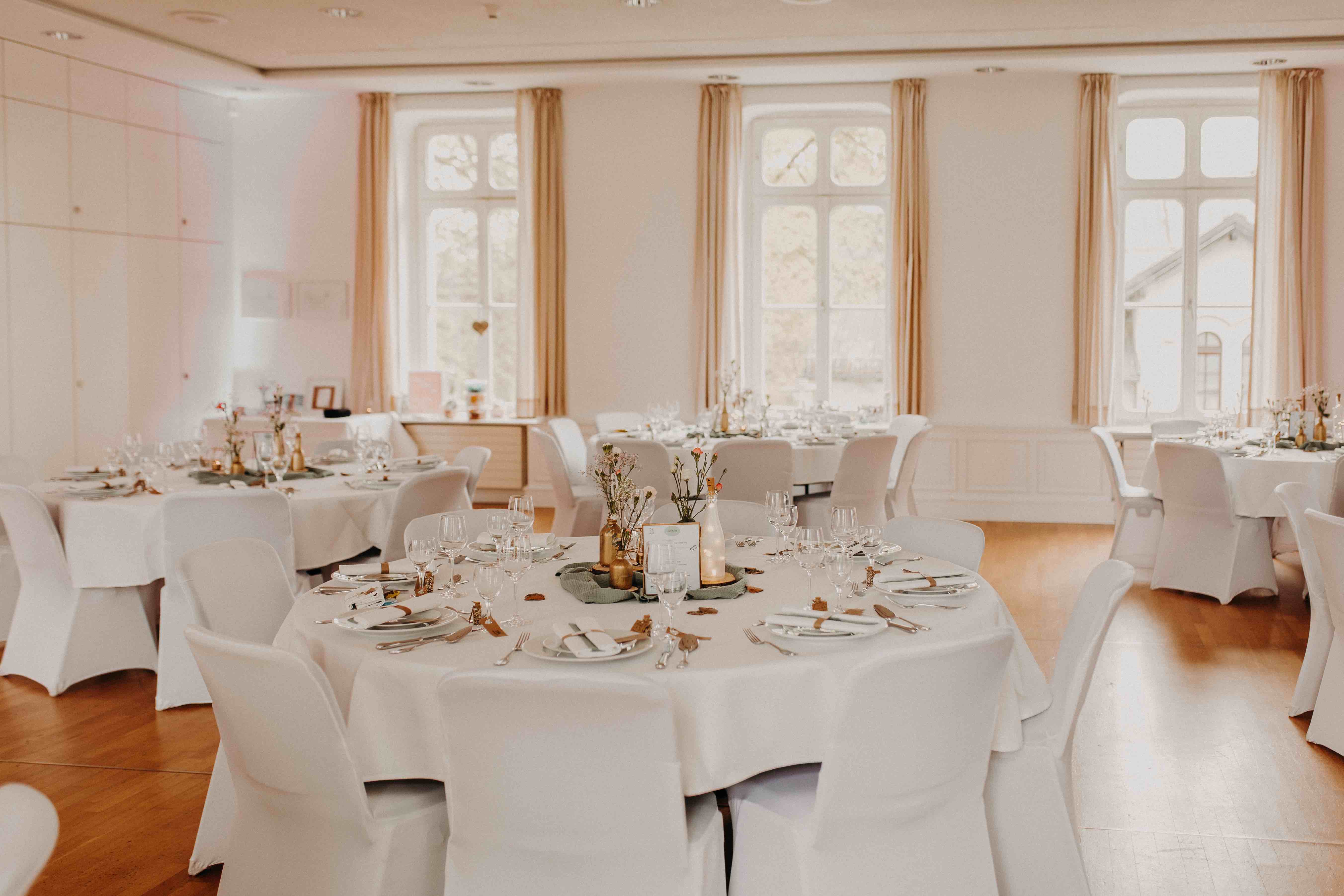 Rundtische und Polsterstühle mit weißen Hussen, alternative Bestuhlung gegen Aufpreis