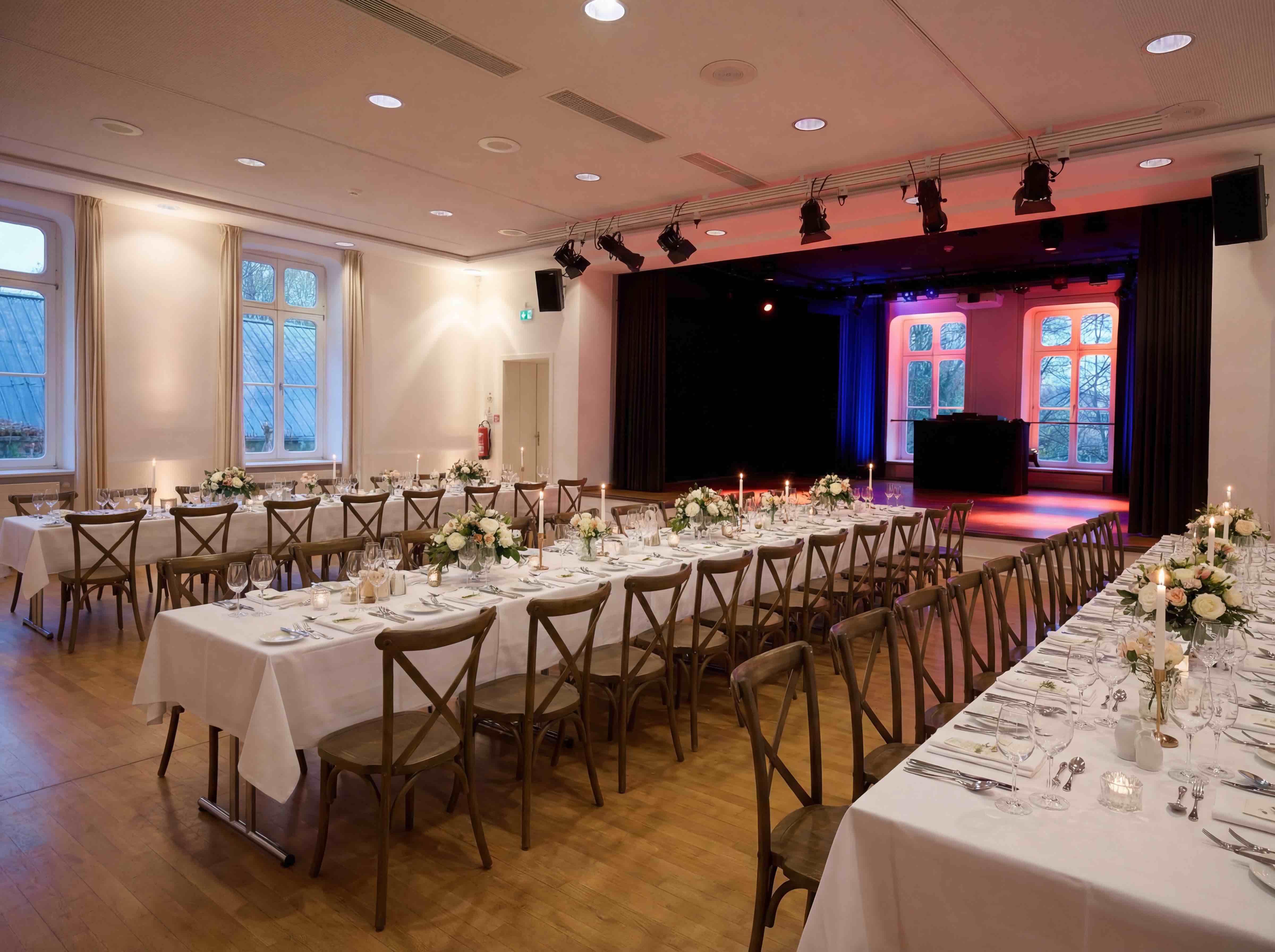 Unser Großer Saal ist das Herzstück der Eventlocation. Hier wird gemeinsam gegessen, gelacht und gefeiert – mit ausreichend Platz für stilvolle Dinner, emotionale Programmpunkte und eine ausgelassene Party bis spät in die Nacht. Ergänzt wird der Große Saal durch einen weiteren, separaten Raum, in dem in der Regel das Buffet aufgebaut wird. So bleibt der Hauptsaal großzügig, ruhig und frei für eure Feier, während sich Gäste entspannt am Buffet bedienen können.