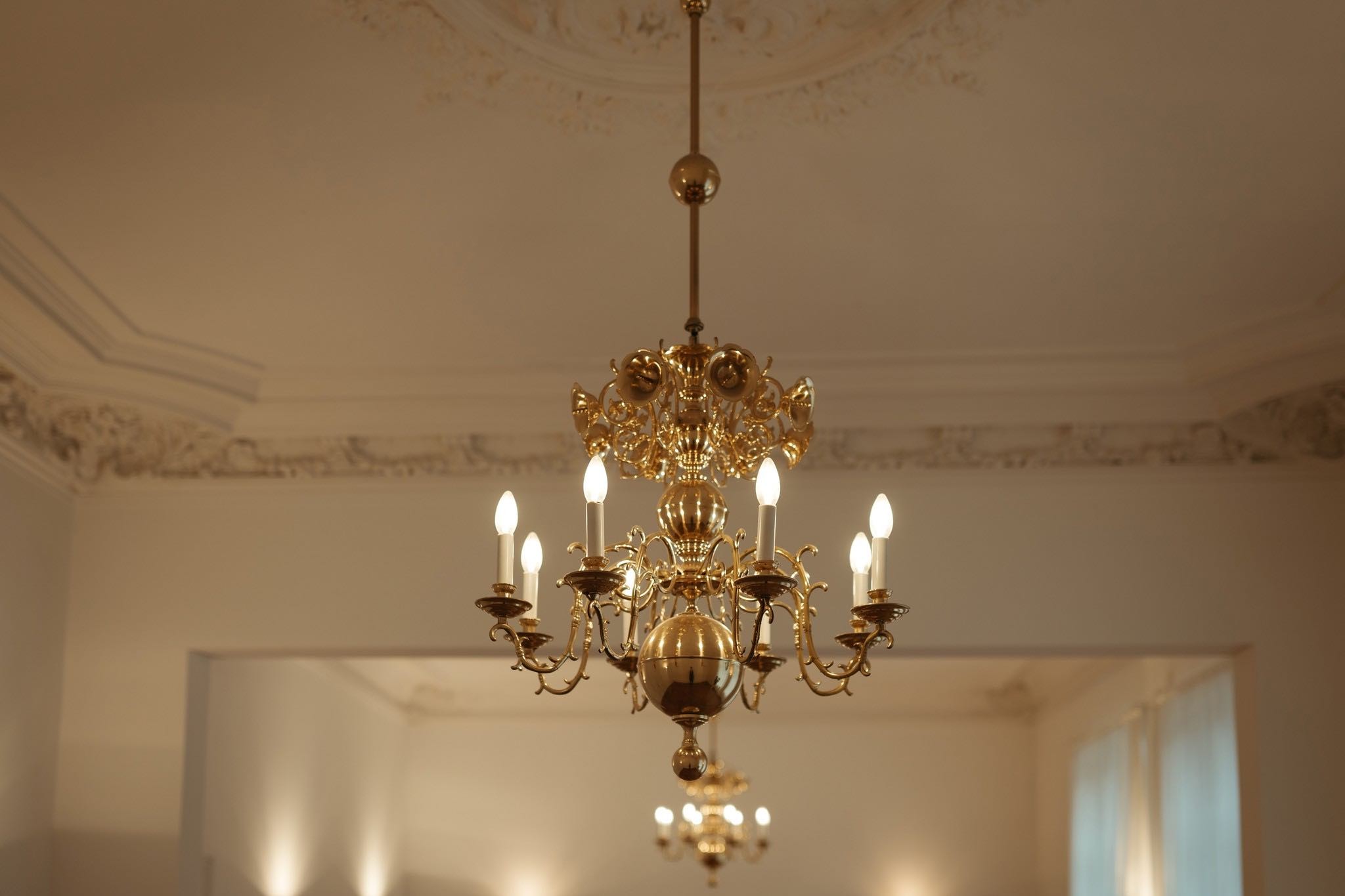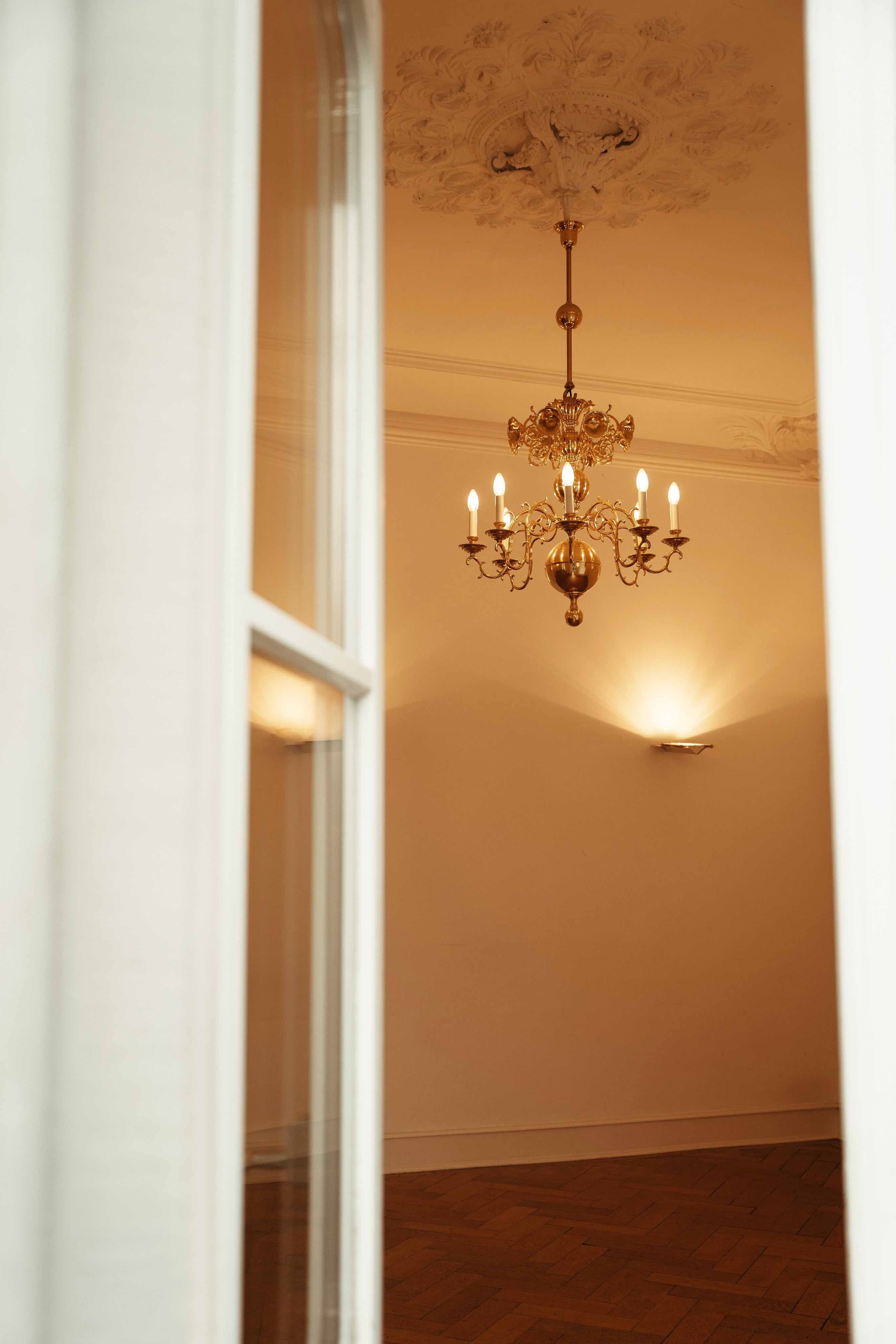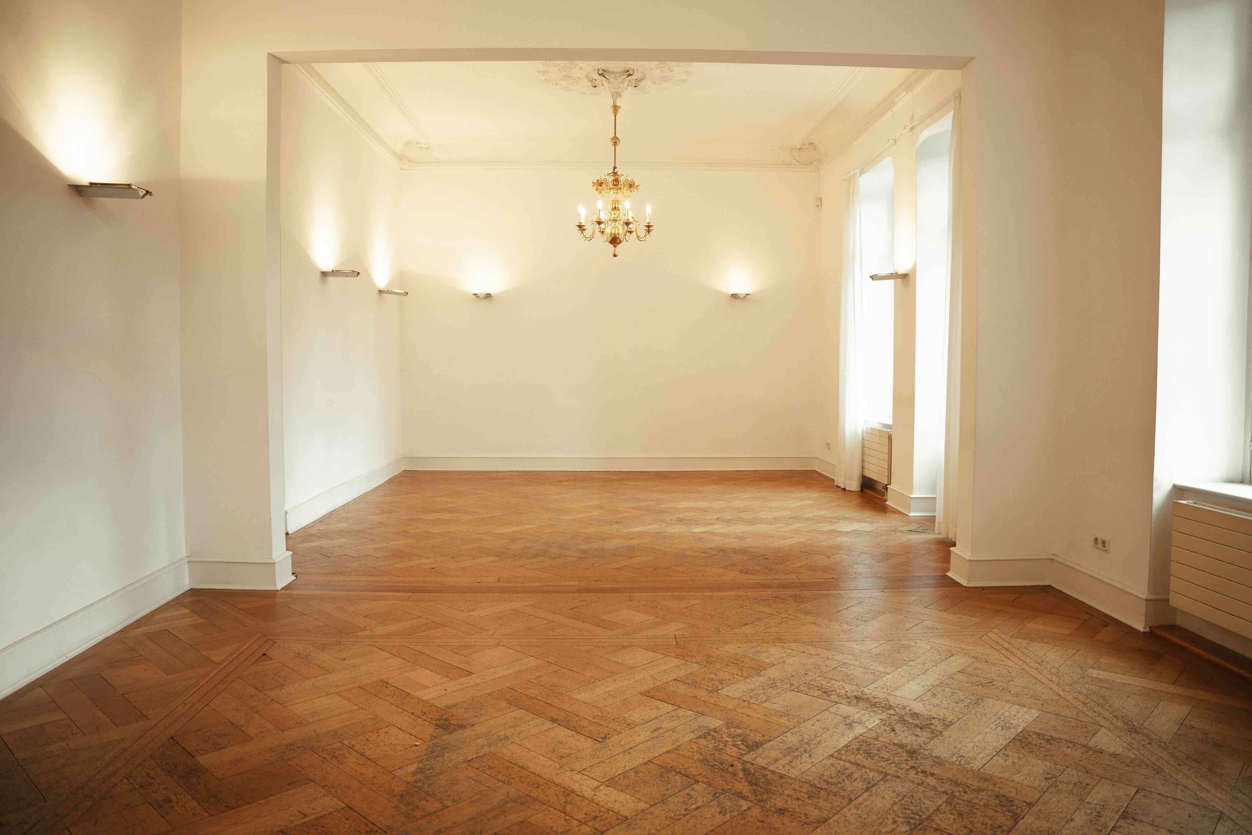 Parkettboden mit Fischgrät, Stuckdecken, goldene Kronleuchter, angrenzende Terrasse